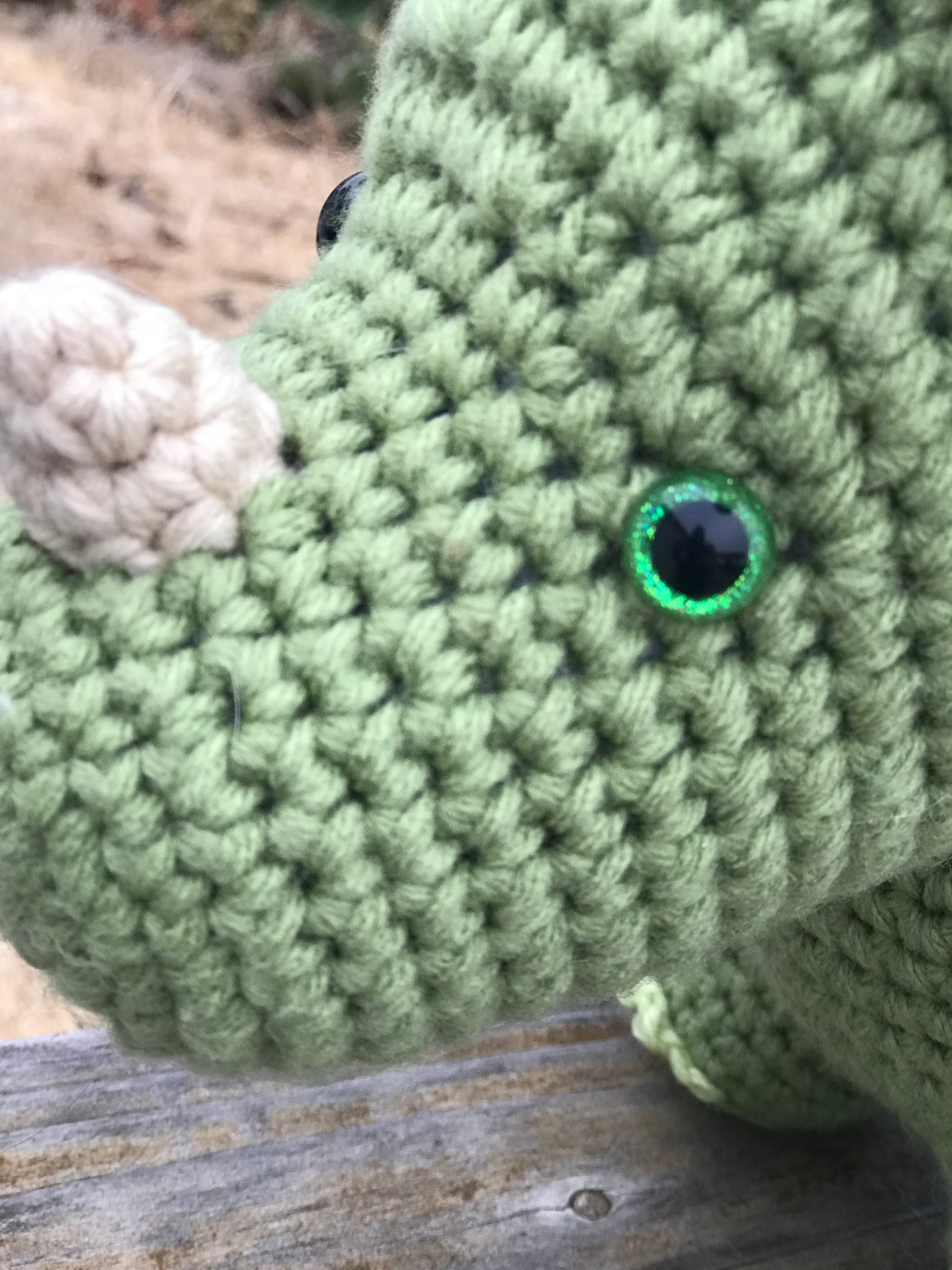 This dinosaur is approximately 16” long and 12” tall. Pick your two favorite colors. Made with durable washable yarn.